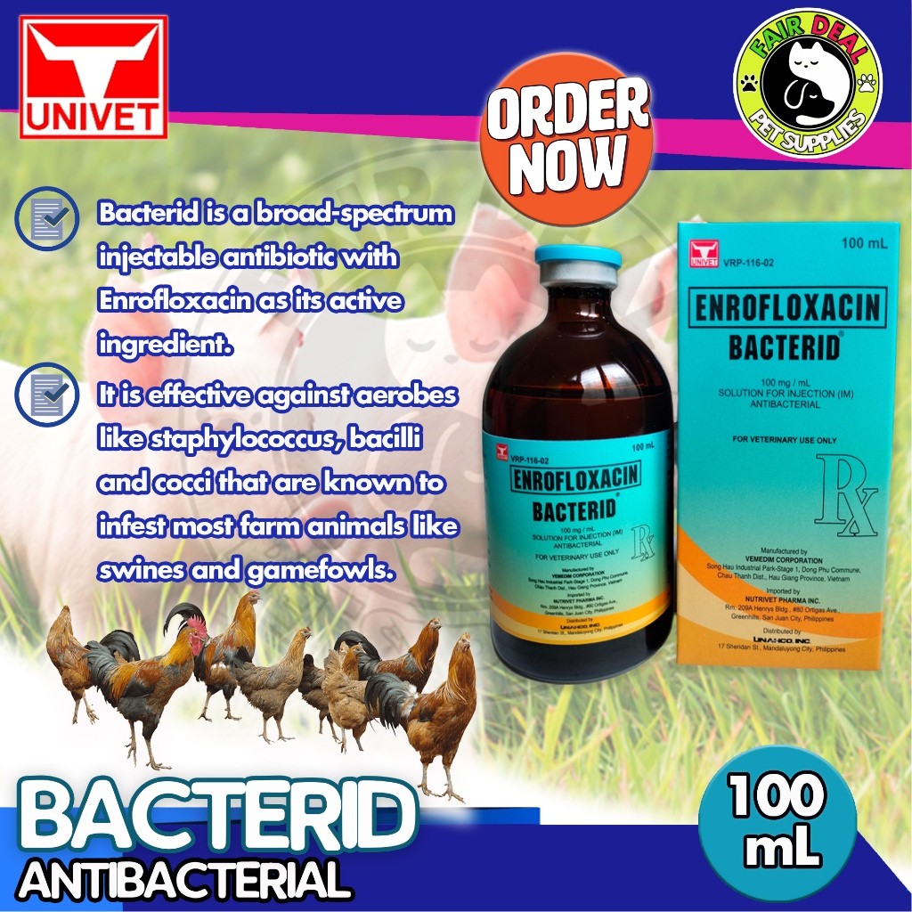 Bacterid is a broad-spectrum injectable antibiotic with Enrofloxacin as its active ingredient. It is effective against aerobes like staphylococcus, bacilli and cocci that are known to infest most farm animals like swines and gamefowls.
